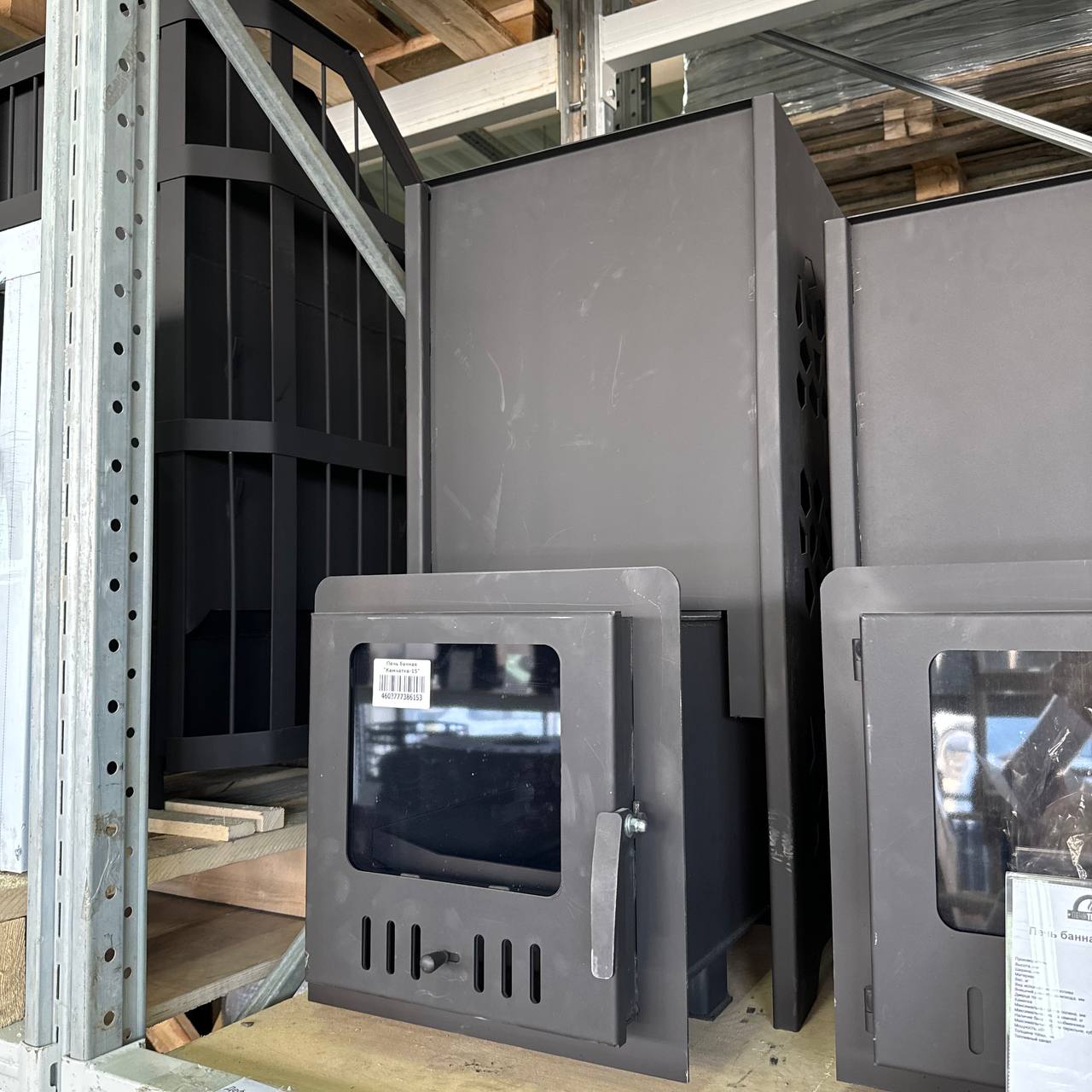 Удобная топочная дверца дровяной печи для бани с панорамным стеклом позволяет наблюдать за процессом горения и визуально контролировать закладку дров и степень сгорания топлива.