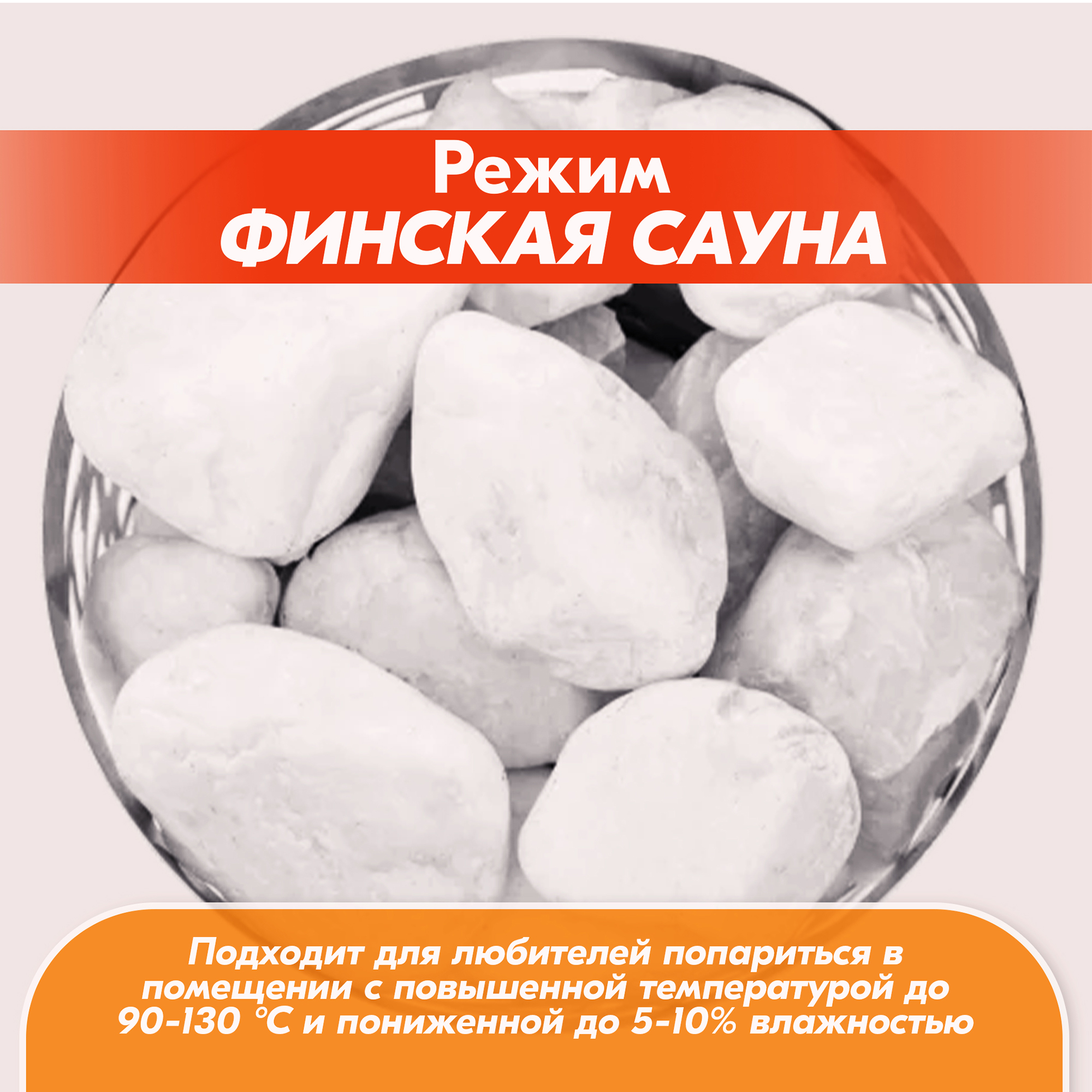 Режим «финская сауна» подходит для любителей попариться в помещении с повышенной температурой до 90-130 °С и пониженной до 5-10% влажностью.