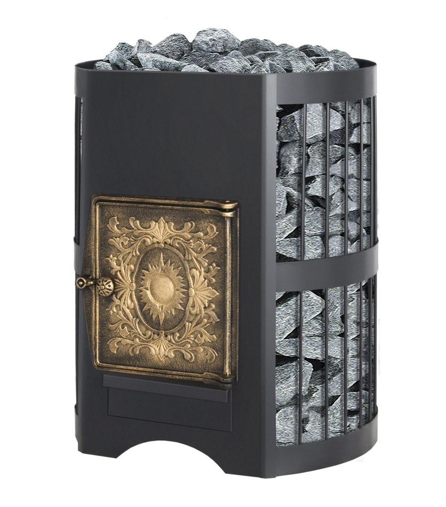 Банная печь Скиф Ч укомплектована топочной глухой чугунной дверцей и имеет конвекционно-вентилируемый кожух (сетка), который изготовлен из калиброванного прута диаметром 6 мм. Дровяная печь Везувий Скиф 12 Ч рассчитана на объем парильного помещения 6-14 м3. В конструкции данной печи не предусмотрен топочный тоннель, что позволяет топить её прямо из парильного помещения.