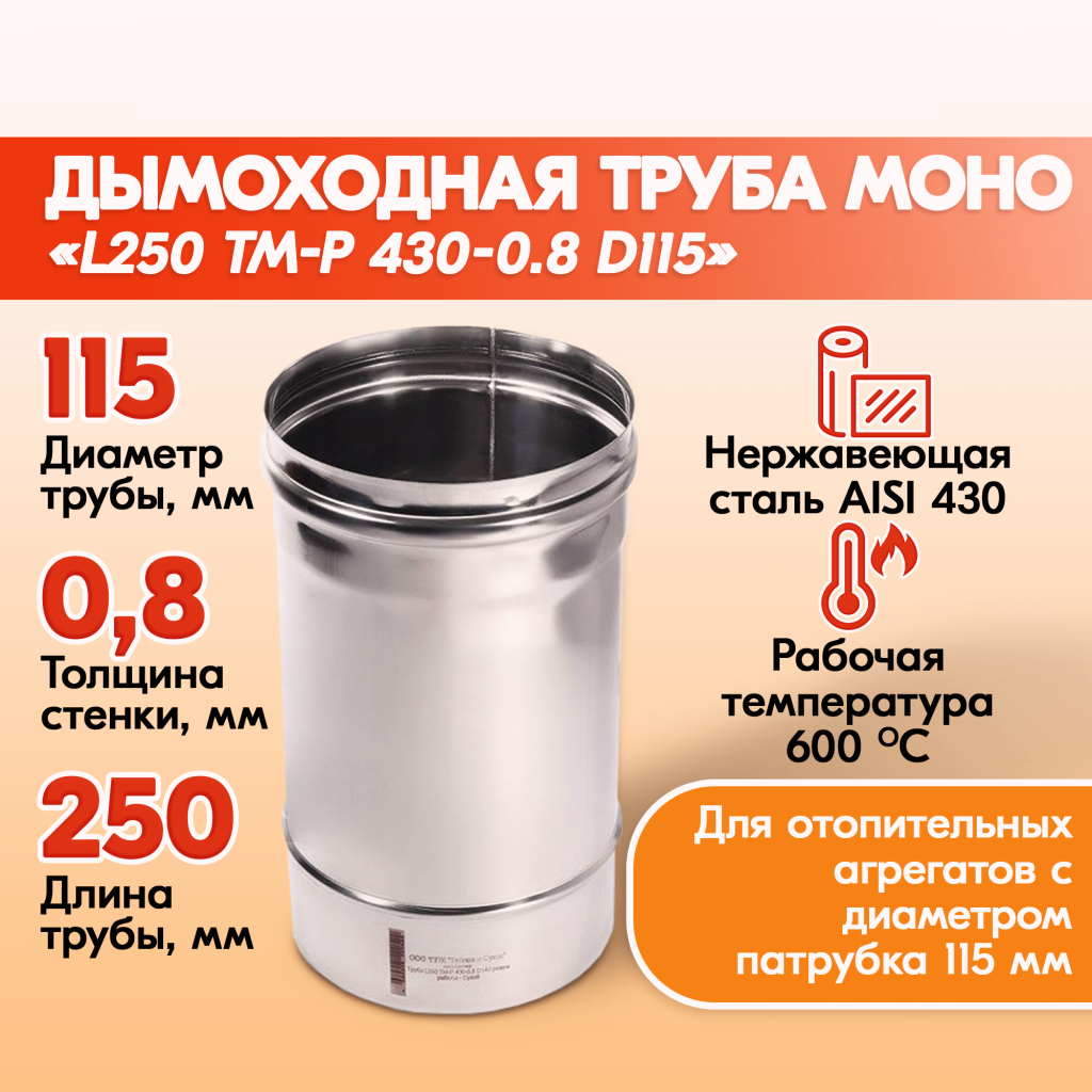 Дымоходная труба Моно от производственной компании Теплов и Сухов – является основным элементом дымоходной системы и предназначена для отведения продуктов сгорания от печей, каминов, котлов, устанавливаемых в индивидуальных и многоэтажных жилых домах, банях, общественных и производственных зданиях.